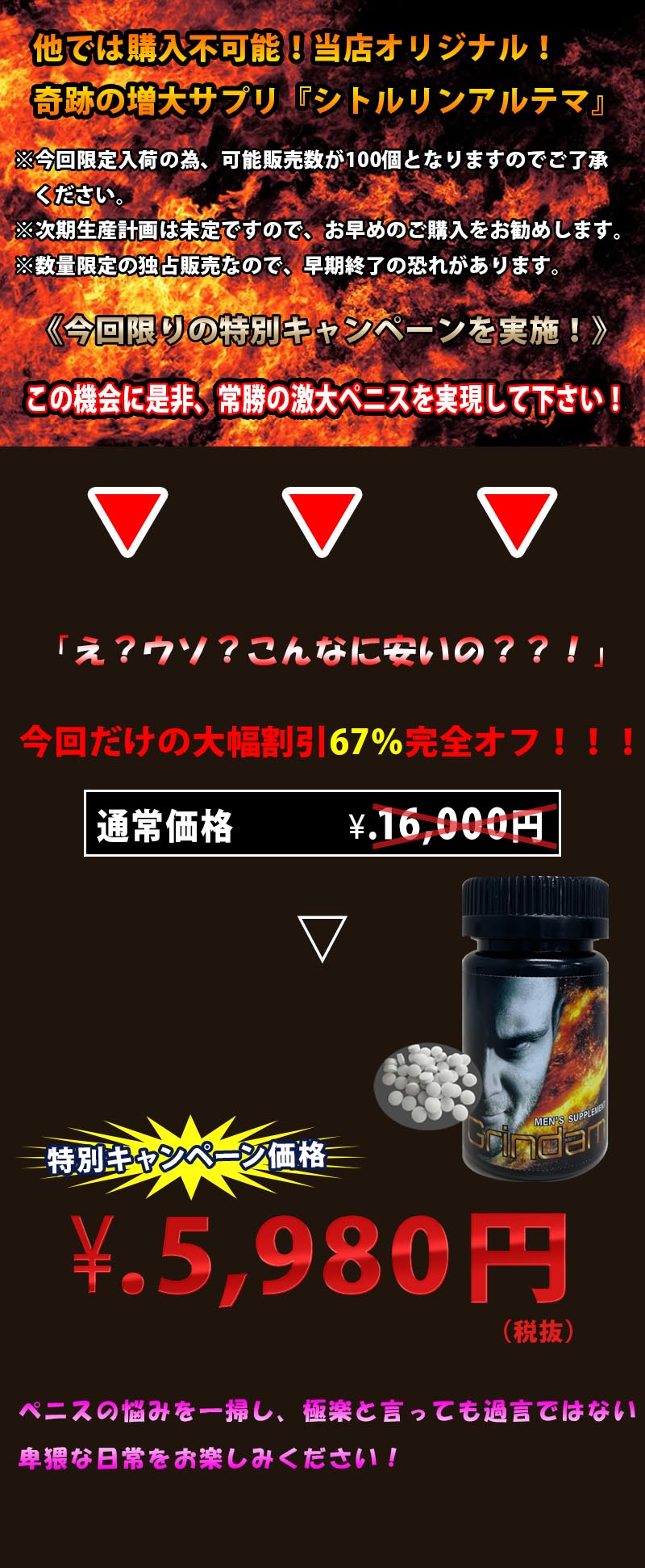 全ての商品 ★当店限定販売オススメ商品★ SuperSALE 初めて・1年ぶりに購入する方限定!半額キャンペーン 新商品 セット商品 サイズアップ 精力促進 包茎・早漏対策 フェロモン 消臭・皮脂対策 肉体改造 除毛・脱毛 お手頃アイテム 悩み別商品一覧 悩みその他 ヒゲが濃い 体臭・ワキ 脂肪・筋肉 欲求不満 包茎・早漏 性欲・精力 陰茎サイズ